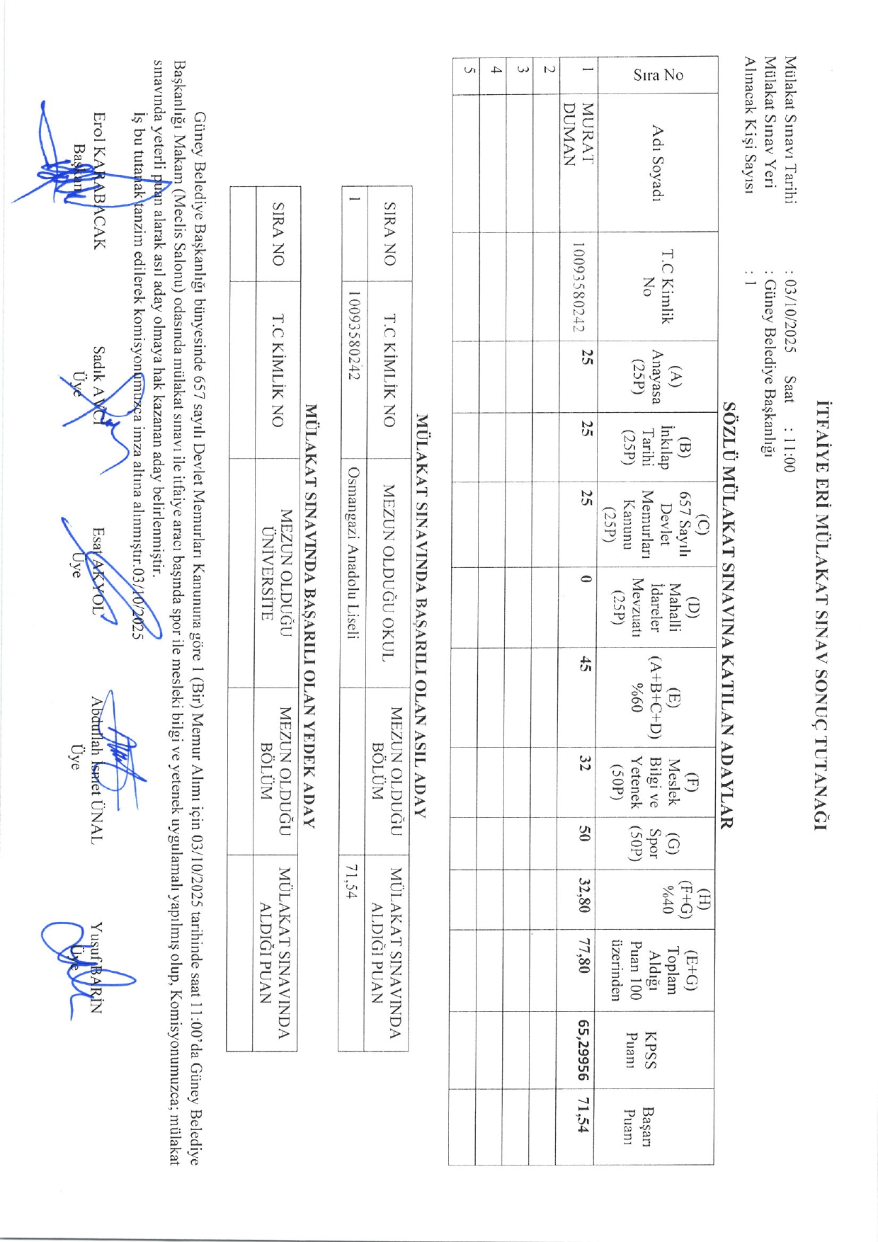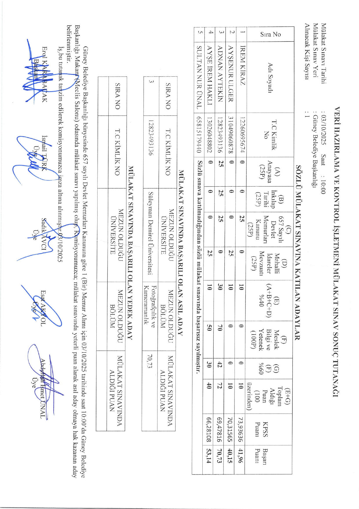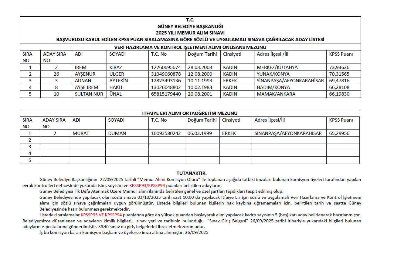 Güney Belediye Başkanlığının 22/09/2025 tarihli “Memur Alımı Komisyon Oluru” ile toplanan aşağıda tatbiki imzaları bulunan komisyon üyeleri tarafından yapılan evrak kontrolleri neticesinde yukarıda isim, soyisim ve KPSSP93/KPSSP94 puanları belirtilen adayların;